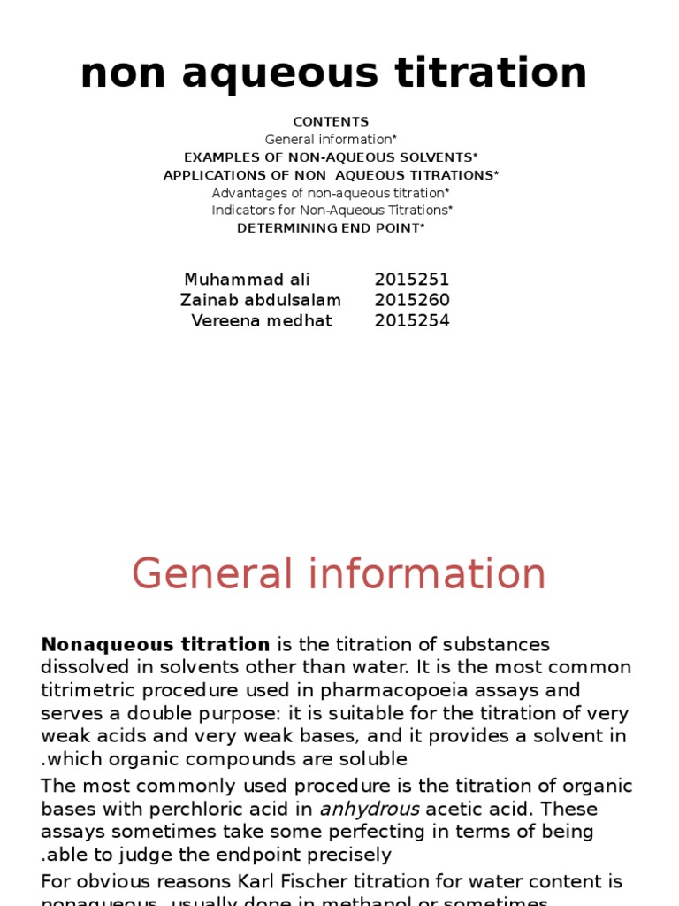 Hence the non-aqueous titrimetric method is used. Titration performed in a solvent-free environment. Non-water titration NATAqueous titration NAT Non-eclectic titration.